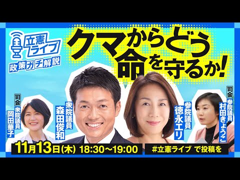 「立憲ライブ―政策ガチ解説―」の第2回目。今回も政策を掘り下げていきます。森田俊和ネクスト環境大臣・徳永エリ政務調査会長代理を迎え、村田きょうこ参院議員・岡田華子衆院議員の司会進行でお話します。ぜひ、ご覧ください。